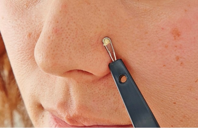 ใช้ด้านที่กดสิวค่อยๆ กดบริเวณจมูก สิวเสี้ยนออกมา ทำมุม 10-20 องศา สิวเสี้ยนจะค่อยๆออกมาอย่างง่ายดายค่ะ ช่วยทำให้บริเวณจมูกเราเรียบเนียนขึ้นนะคะ แนะนำให้ทำสัปดาห์ละ 1-2 ครั้งค่ะ